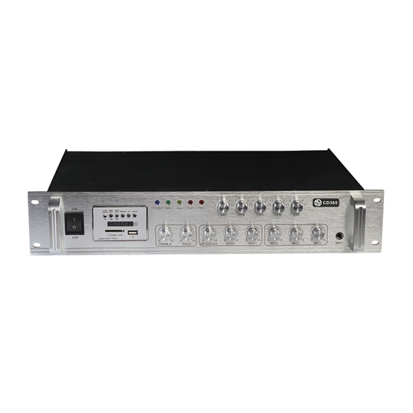 | PA-150WT5P | 1、五路分區(qū)獨(dú)立調(diào)節(jié)控制功能。 2、三路話筒輸入,三路線路輸入,一路線路輸出。 3、話筒1具有默音功能,便于插入優(yōu)先廣播,帶叮咚提示音,話筒,線路單獨(dú)音量控制,總音量控制,低音音調(diào)控制。 4、自帶MP3播放器,帶LED數(shù)碼顯示屏,有USB和SD接口可直接讀盤,有FM收音功能,MP3內(nèi)置四種播放模式;隨機(jī)、單曲循環(huán)、文件內(nèi)循環(huán)、全部循環(huán)。 5、帶紅外遙控器功能,所有操作均可遙控操作,遙控距離5-10米。 6、70V/110V定壓輸出,4-16Ω定阻輸出。 7、本機(jī)面板顏色為:銀色鋁拉絲。 8、完善的輸出保護(hù)以及整機(jī)過熱、過壓、過流、中點(diǎn)保護(hù)。 | 額定功率150W,輸出方式:定壓70v/110v,定阻4-16Ω。線路輸出:600Ω/300mV。輸入:Mic1,2/600Ω,2.0Mv,非平衡,AUX1,2/10KΩ,100mV,非平衡。頻響:100Hz-16KHz。諧波失真THD:<0.1%1KHz.信噪比S/N:MIC1,2:66dB AUX1,2:7OdB.音調(diào)調(diào)節(jié):Bass:±10dB.保護(hù):過壓保護(hù),直流保護(hù),短路保護(hù),過熱保護(hù)。靜音:MIC1具有優(yōu)先權(quán).電壓:AC220V/50Hz。尺寸:482*89*335MM.重量:8.7Kg. |